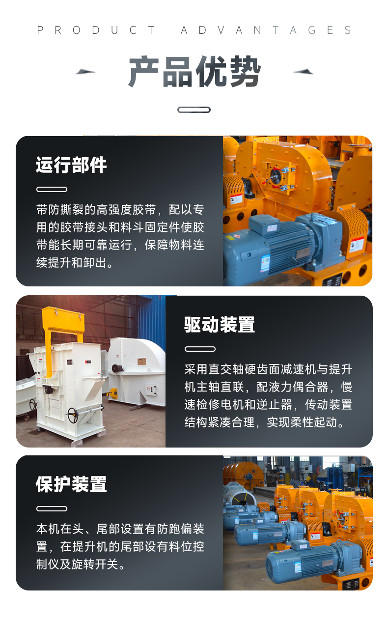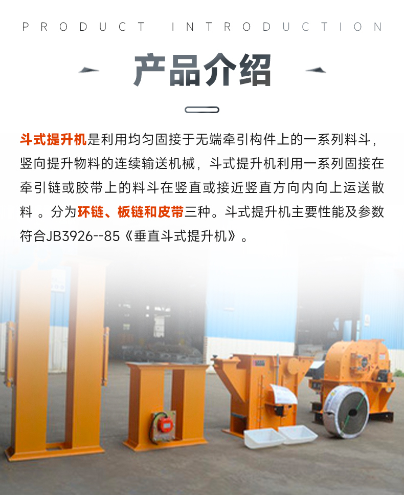 本机全称板式套筒滚子链斗式提升机(简称板链斗式提升机),按国家标准设计制造,采用重力方式卸料,以板式套筒滚子链为牵引件,适于输送堆积比重《2t/m3,块度分别为55、80、110毫米磨琢性物料,物料温度不超过250℃,如块煤、碎石、矿石、卵石等。本机输送量16~480m3/h,提升高度:5~40米。